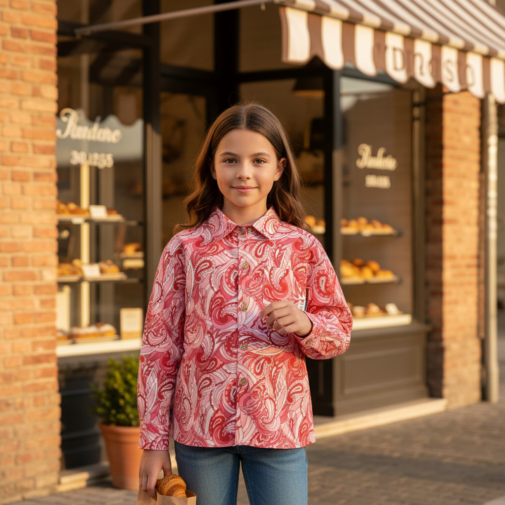 A girl standing at front of the bakery wearing oversized linen shirt with classic paisley design in pinks, white and red -by MiramaraAustin Kids Linen Shirt-Paisley