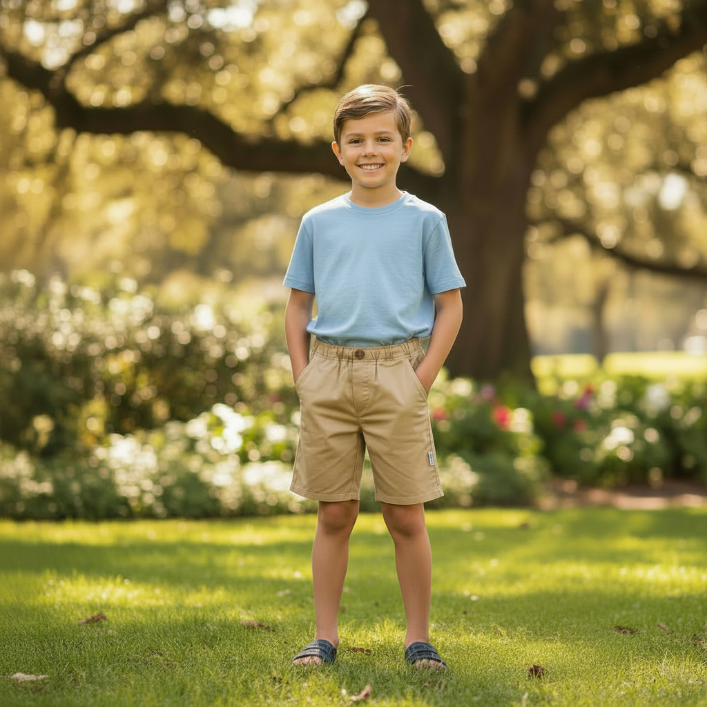 The Ben Boys Shorts – Sand are a versatile, neutral-toned essential handmade in our Sydney studio, designed for comfort, style, and longevity. Crafted from stretch cotton twill, these shorts feature a faux zipper, decorative button, and elastic waistband that makes them easy for kids to pull on independently.