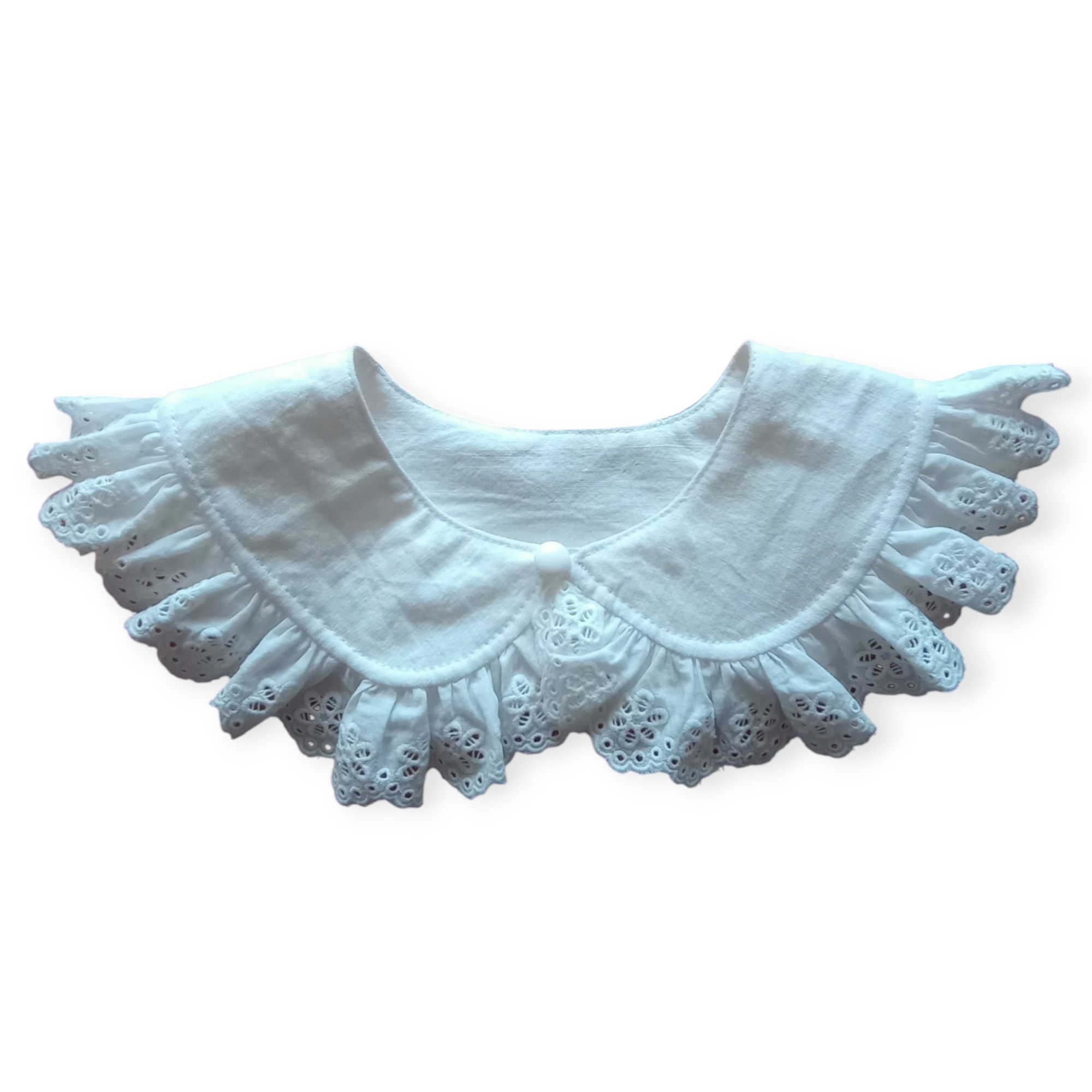 Kids Detachable Collar Anica is created using cotton and lovely cotton embroidery lace. For the closure there is a small white button and handmade thread loop. Size S is suitable for 2,4 and 6 year old kids, while size L for 8-10 year olds. The collar is not tight fitting so the size is just a guide as each size will fit older kids as well.