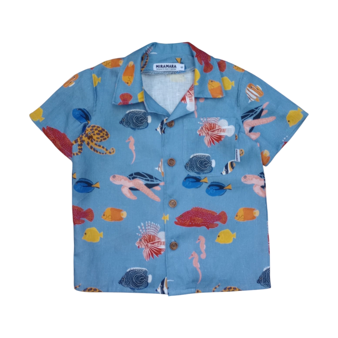 is one of our most loved designs, featuring playful prints of fish, seahorses, and tortoises. Made from soft French linen, this semi-fitted shirt is available in long sleeve options and sized true to age (2–10). With its Cuban collar, wooden buttons, and a pocket detail, it’s a versatile piece that looks great with shorts or long pants. Though listed under boys’ shirts, it is equally suitable for girls, making it a timeless unisex choice.