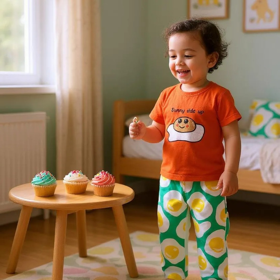This T-shirt pairs perfectly with our Kids Unisex Shorts – Eggs, but also looks great with skirts, jeans, or long pants like our Charlie Pants, which share the same food-themed prints. The design is simple, kid-friendly, and full of character — ideal for everyday wear or gifting.