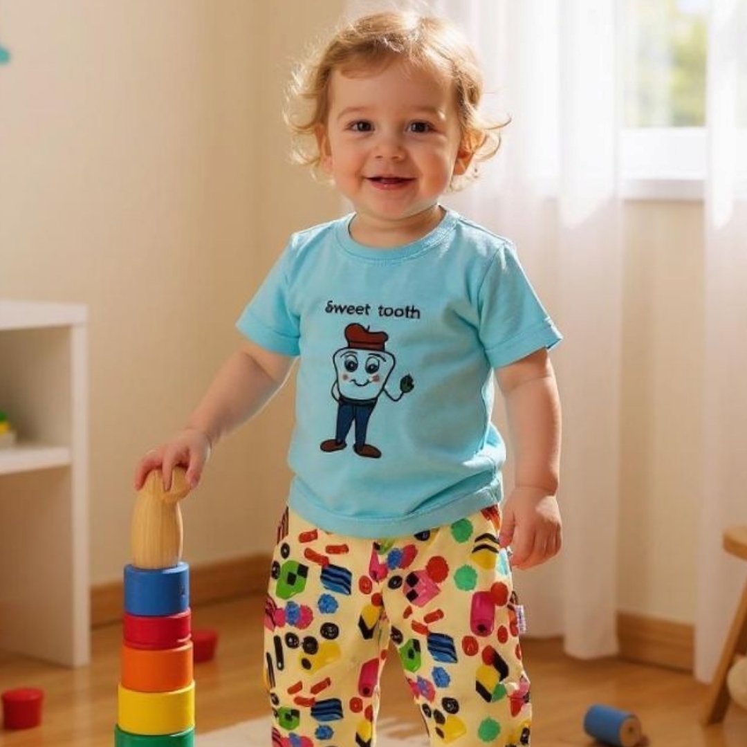 The Kids Unisex T-shirt Sweet Tooth is a playful design that pairs perfectly with our Unisex Kids Shorts – Licorice. Featuring a cheerful cartoon tooth and the phrase “Sweet tooth”, this shirt is a fun way to spark conversations about dental hygiene and healthy habits.