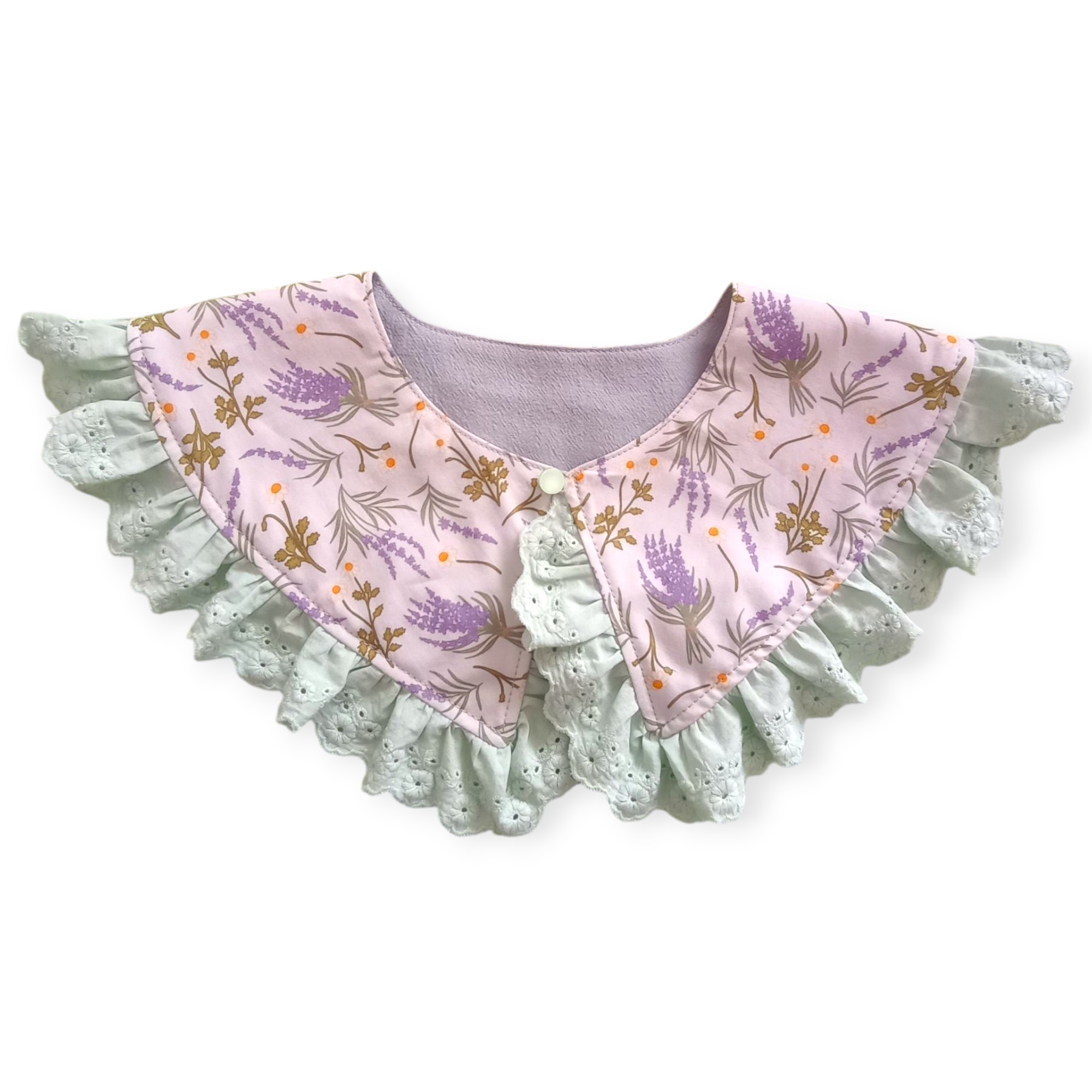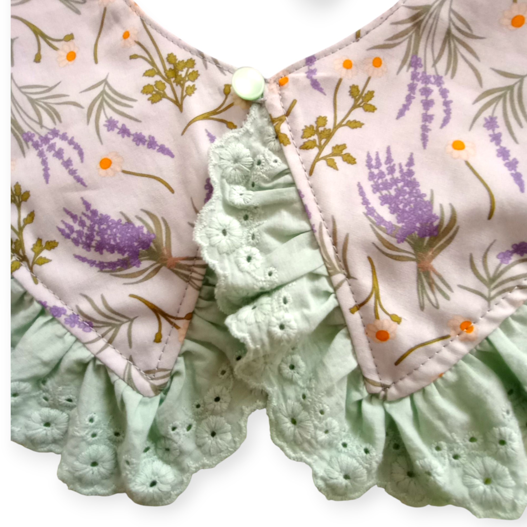 is made using original textile artwork. That guarantees that not many people will have this collar as we make print quantities of fabric. The printing is Oeko Tex Standard 100 Certified, and it is done on an organic cotton poplin. This charming print is paired with lovely green lace. For the closure there is a small green shank button and handmade thread loop. Ladies collars come in one size for easy ordering. Each one is made upon your order until fabric runs out.
