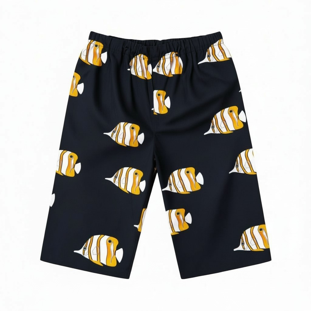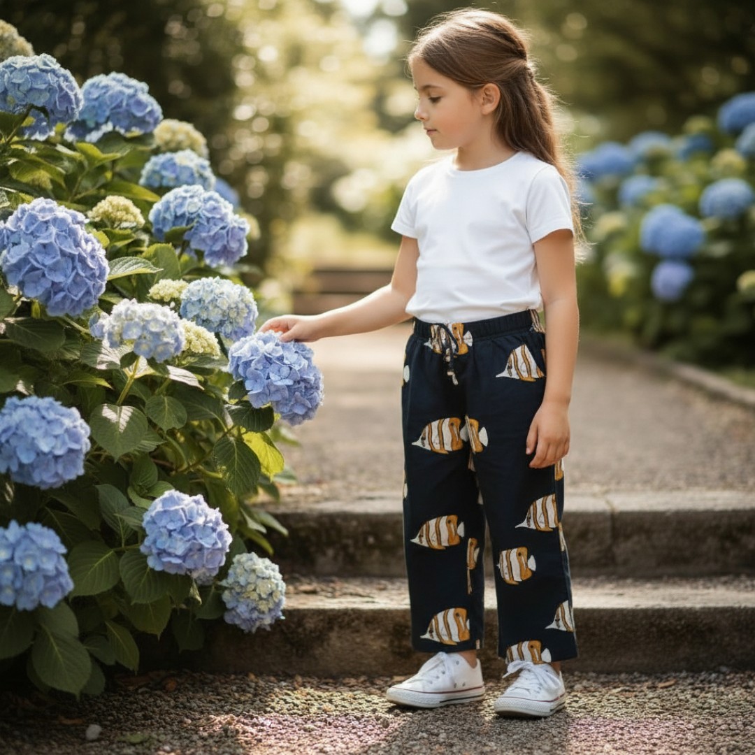 are ankle-length wide-leg pants featuring our original fish print. Designed in our Sydney Hills studio and shipped worldwide, these culottes bring playful originality to kids’ wardrobes. Though listed in the girls’ collection, they are equally suitable for boys who love unique prints.