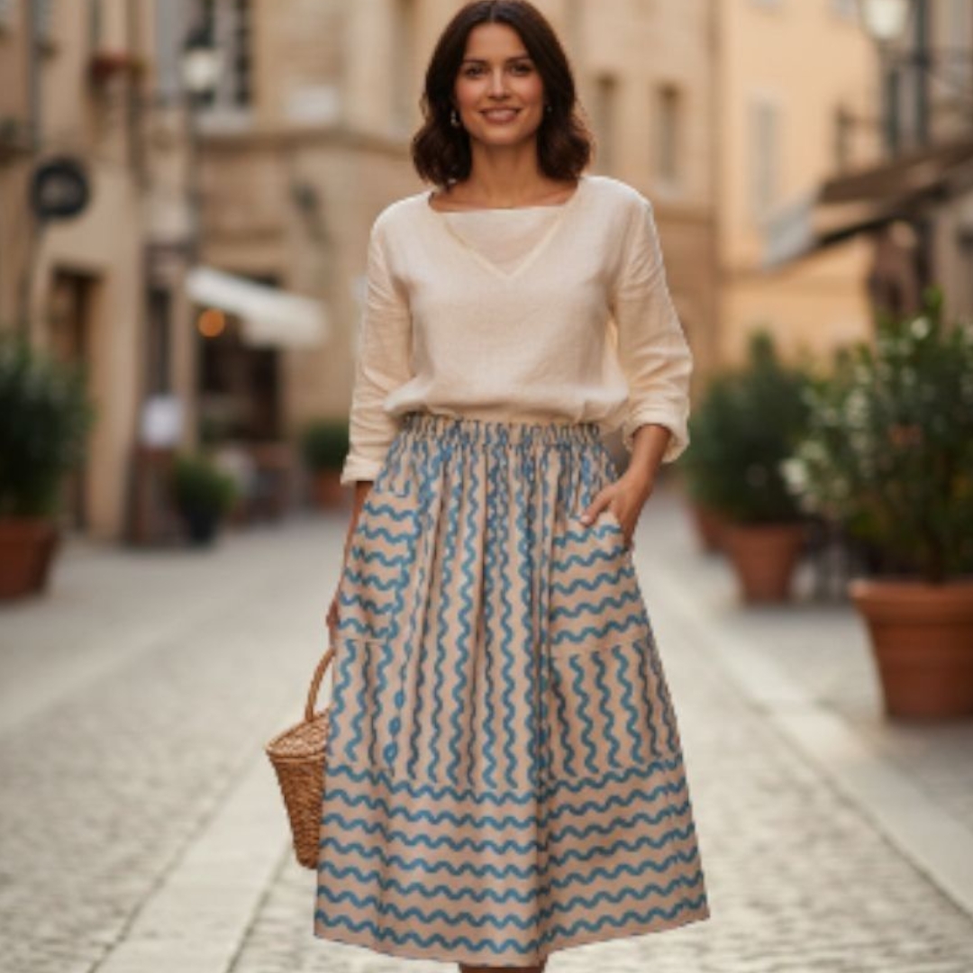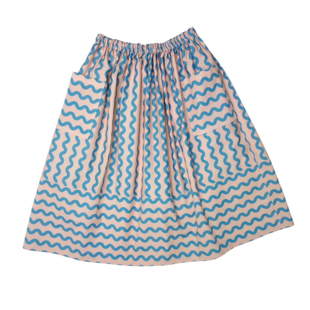 The Organic Cotton Gathered Skirt–Waves is a beautifully draped, mid-length skirt handmade in our Sydney studio using soft organic cotton twill. Designed for comfort and style, it features a wide elastic waistband, roomy patch pockets, and a playful print placement that adds visual interest and movement.