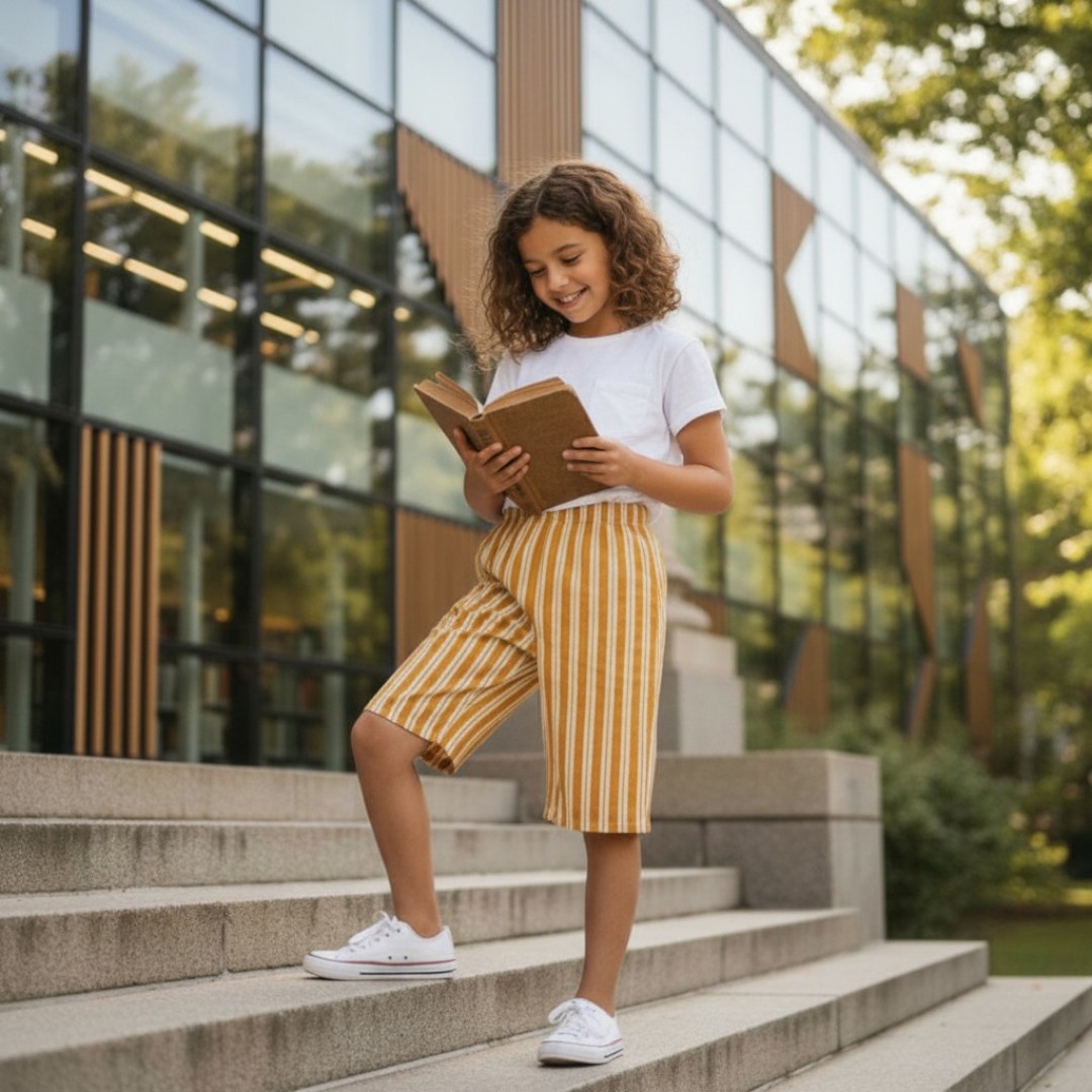 a girl is standing at front of a library holding an open book, dressed in white T-shirt and stripey Bermudas, organic kids stripe shorts-marino - by MiramaraOrganic Kids Stripe Shorts-Marino