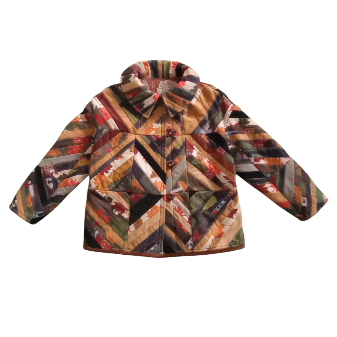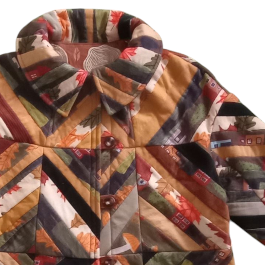 This warm and cozy jacket features three layers: a striking patchwork exterior, a soft linen lining, and a thick cotton batting for insulation — making it ideal for cooler days. It’s finished with three large resin buttons down the front and a snap button at the collar for added comfort and style.