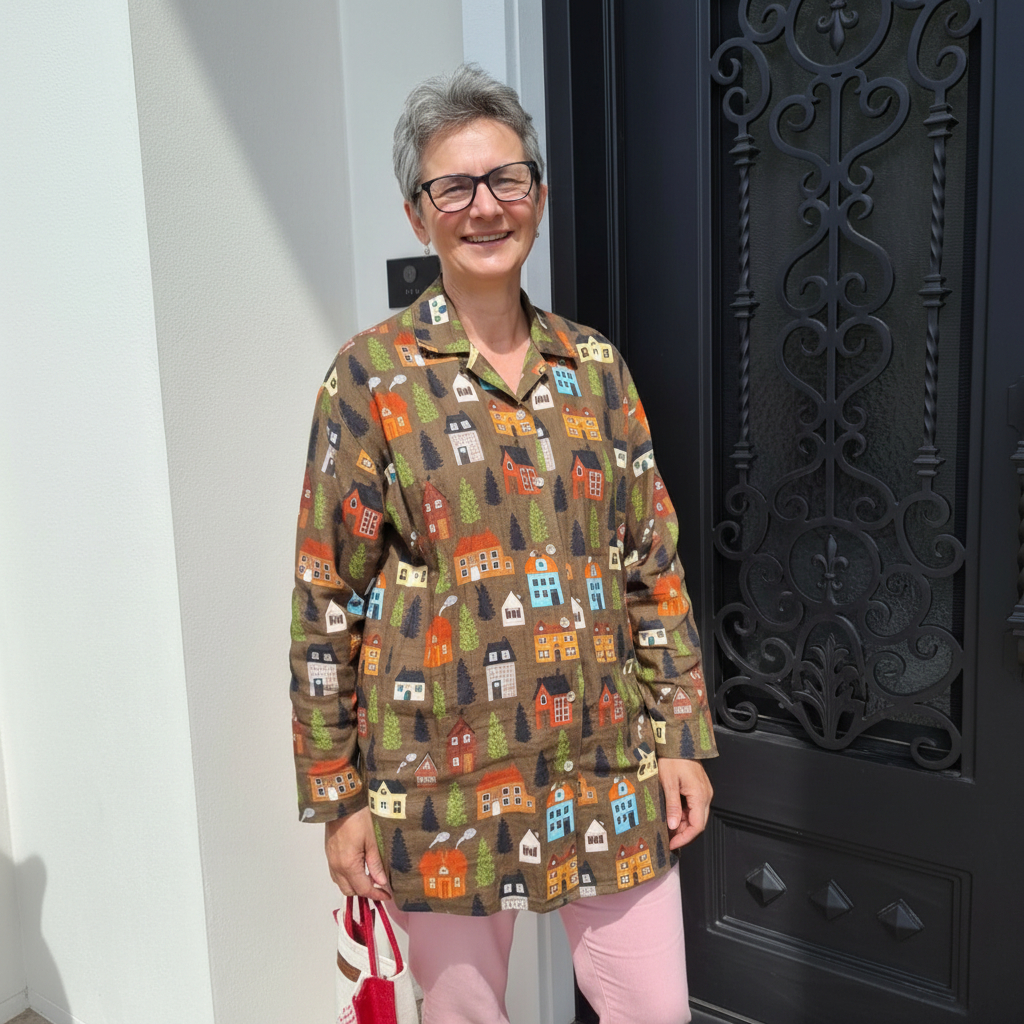 The Women’s Linen Shirt-Village features Miramara’s original artwork — a whimsical village print that evokes warmth, creativity, and homely vibes. This relaxed-fit long sleeve shirt is perfect for everyday wear and can also be styled as an oversized shacket for layering.